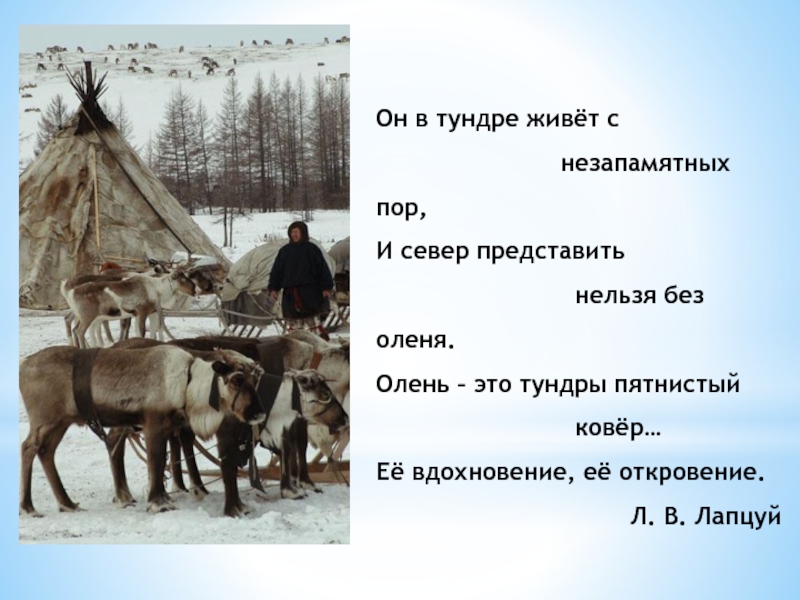 Коренные народы Севера в тундре не могут прожить без оленя. Вся жизнь оленеводов связана с ним. Этот «северный красавец», называемый по-ненецки ИЛЕБЦЯ (жизнь), действительно является символом ЖИЗНИ И ПРОЦВЕТАНИЯ для северного народа.