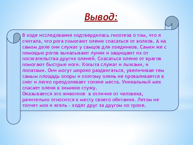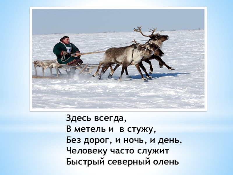 Я считаю, что широкие копыта, ветвистые рога, мех, стройное тело, длинные и тонкие ноги помогают оленю проживать в суровых климатических условиях Крайнего Севера.