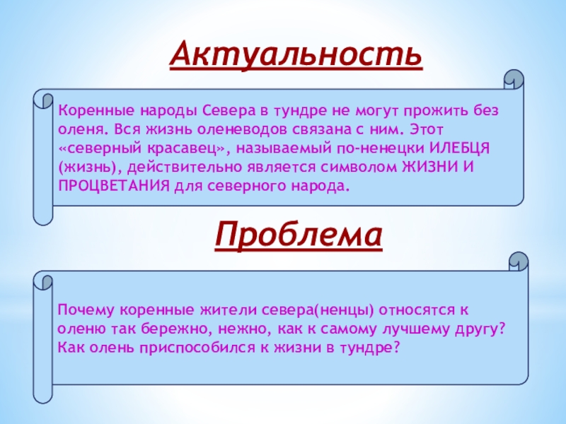 Коренные народы Севера в тундре не могут прожить без оленя. Вся жизнь оленеводов связана с ним. Этот «северный красавец», называемый по-ненецки ИЛЕБЦЯ (жизнь), действительно является символом ЖИЗНИ И ПРОЦВЕТАНИЯ для северного народа.