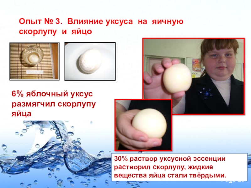 30% раствор уксусной эссенции растворил скорлупу, жидкие вещества яйца стали твёрдыми.