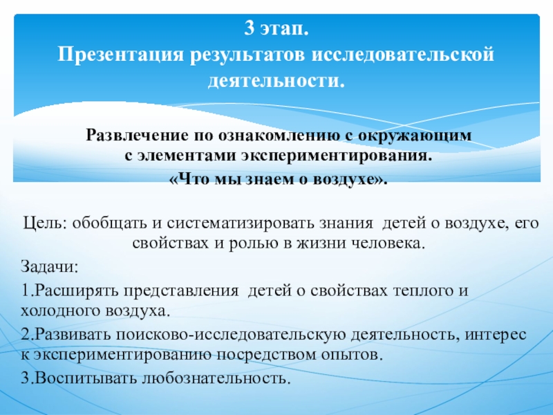 Предполагаемый результат: Получение элементарных представлений о воздухе, его свойствах, значении. Приобретение навыков проведения опытов и экспериментов, в ходе которых можно познакомиться со свойствами воздуха. Развитие познавательных интересов, любознательности детей.