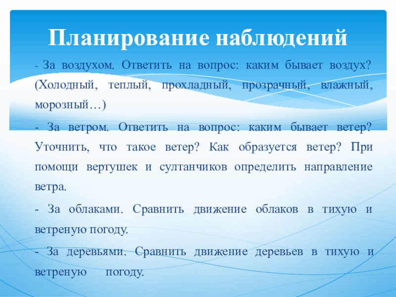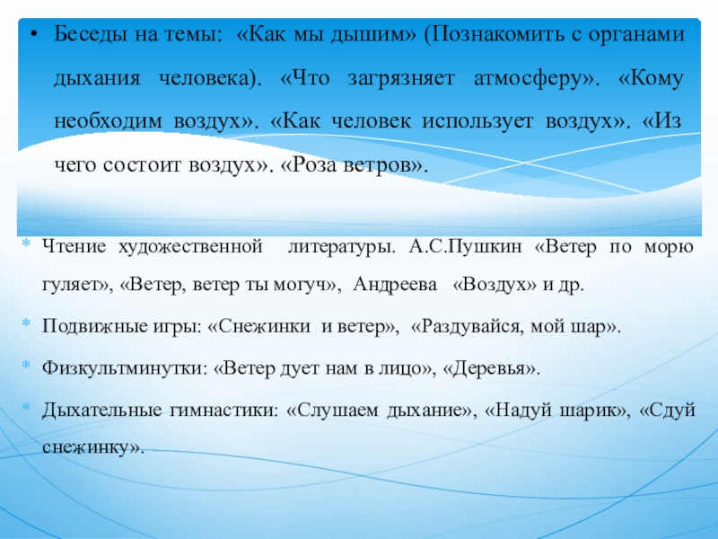 Беседы на темы: «Как мы дышим» (Познакомить с органами дыхания человека). «Что загрязняет атмосферу». «Кому необходим воздух». «Как человек использует воздух». «Из чего состоит воздух». «Роза ветров».