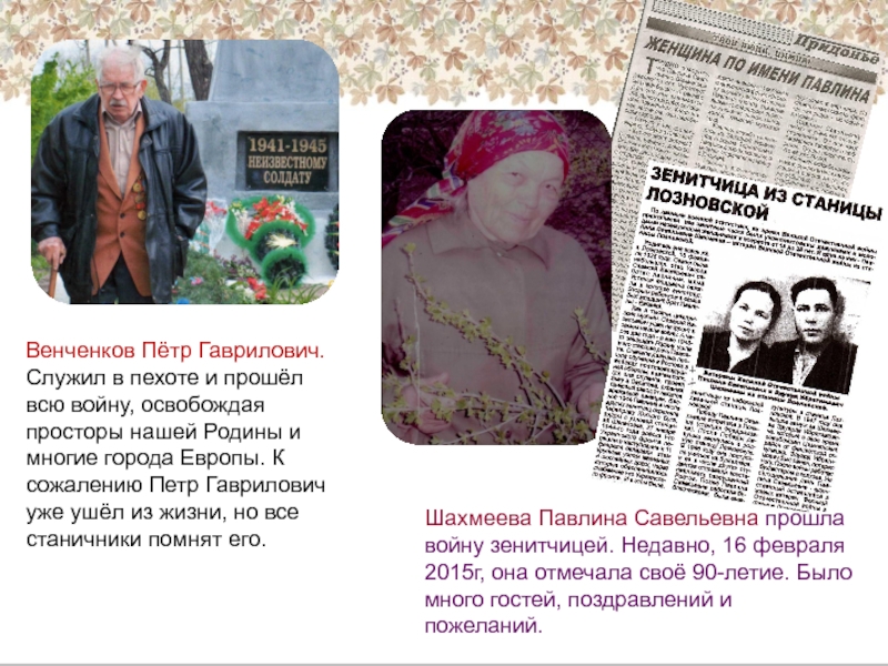 Шахмеева Павлина Савельевна прошла войну зенитчицей. Недавно, 16 февраля 2015г, она отмечала своё 90-летие. Было много гостей, поздравлений и пожеланий.