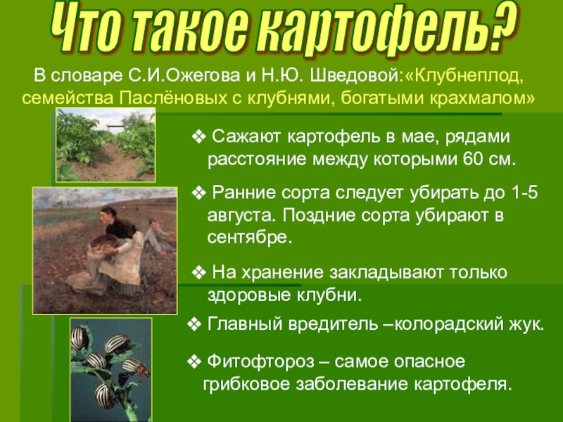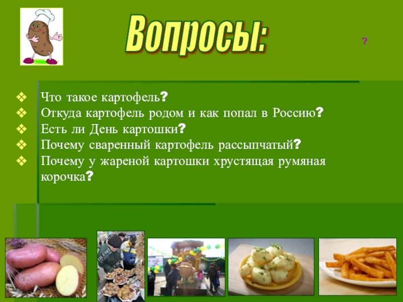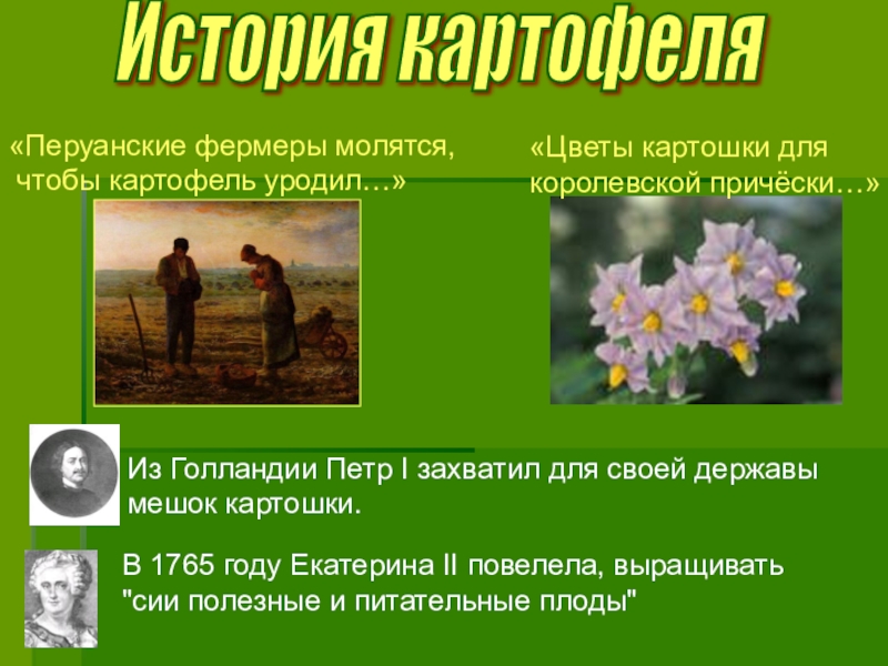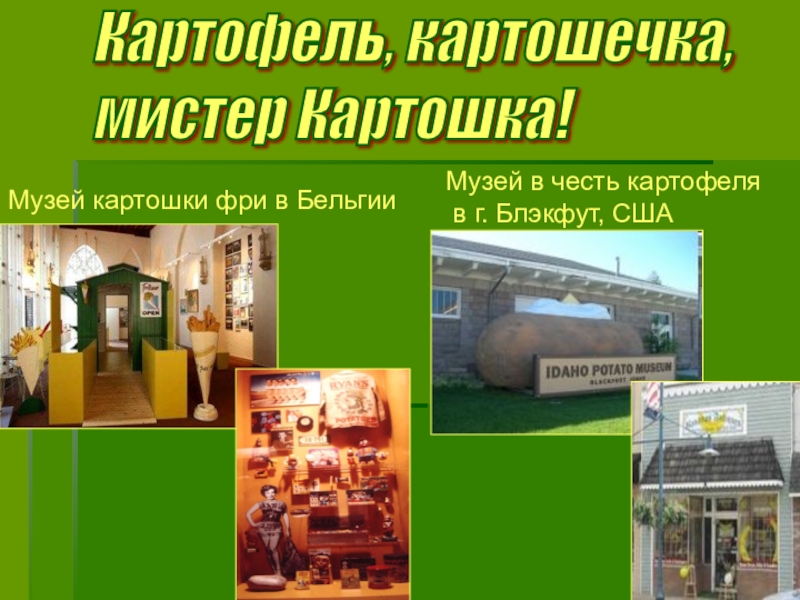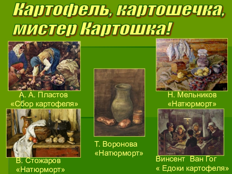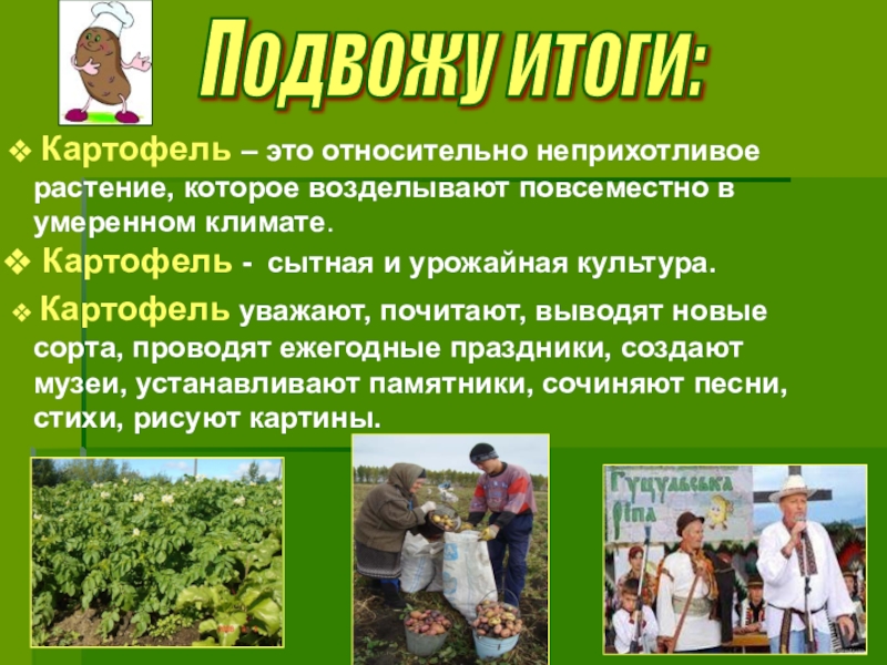 Картофель уважают, почитают, выводят новые сорта, проводят ежегодные праздники, создают музеи, устанавливают памятники, сочиняют песни, стихи, рисуют картины.