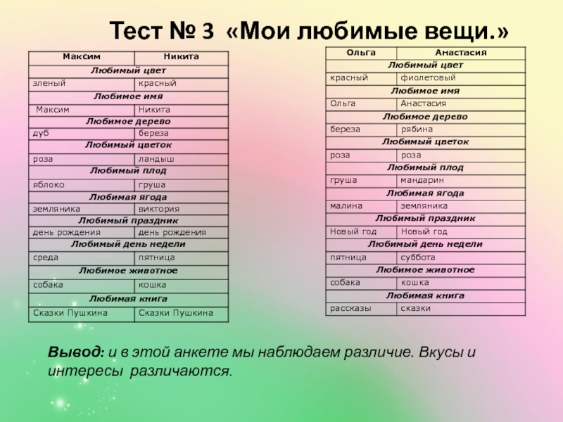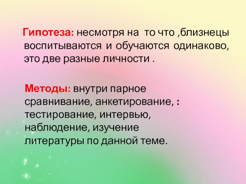 Методы: внутри парное сравнивание, анкетирование, : тестирование, интервью, наблюдение, изучение литературы по данной теме.