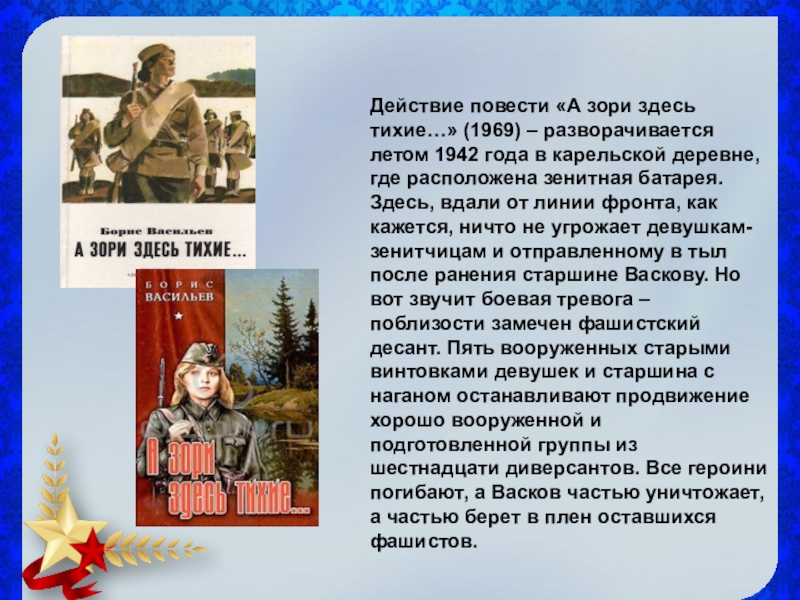 Действие повести «А зори здесь тихие…» (1969) – разворачивается летом 1942