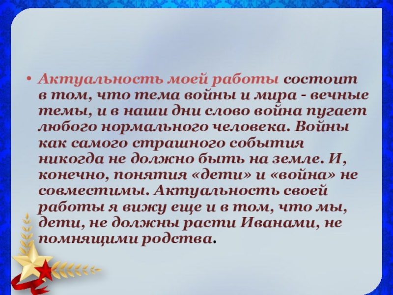 - вечные темы, и в наши дни слово война пугает любого нормального человека. Войны как самого страшного события никогда не должно быть на земле. И, конечно, понятия «дети» и «война» не совместимы. Актуальность своей работы я вижу еще и в том, что мы, дети, не должны расти Иванами, не помнящими родства.