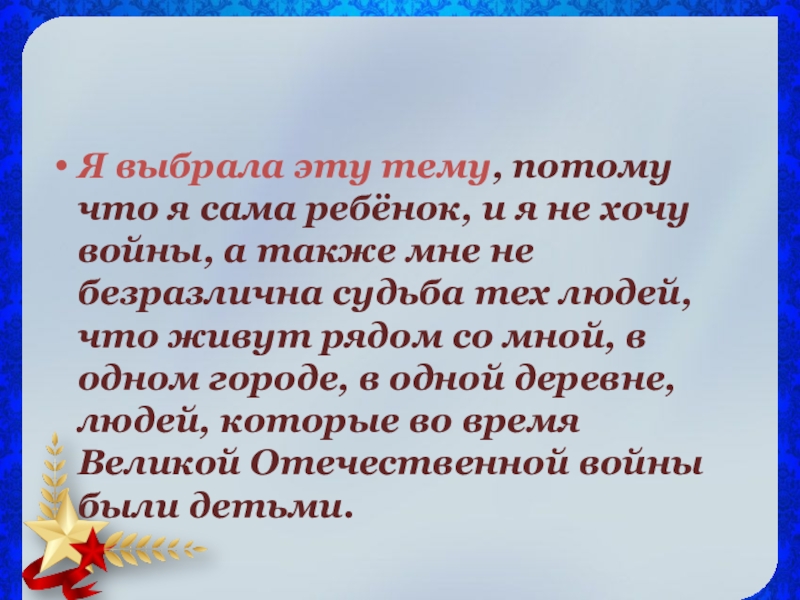 не хочу войны, а также мне не безразлична судьба тех людей, что живут рядом со мной, в одном городе, в одной деревне, людей, которые во время Великой Отечественной войны были детьми.