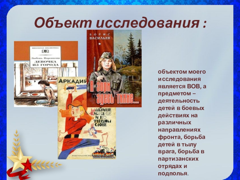 объектом моего исследования является ВОВ, а предметом –деятельность детей
