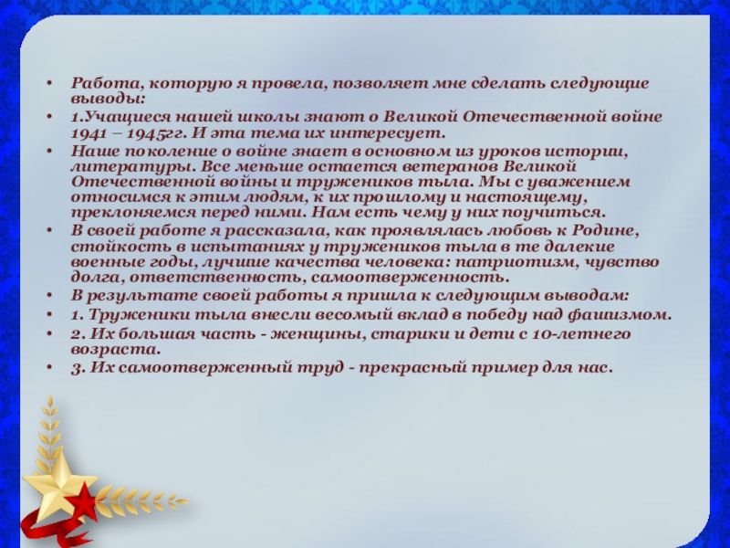 В своей работе я рассказала, как проявлялась любовь к Родине, стойкость в испытаниях у тружеников тыла в те далекие военные годы, лучшие качества человека: патриотизм, чувство долга, ответственность, самоотверженность.