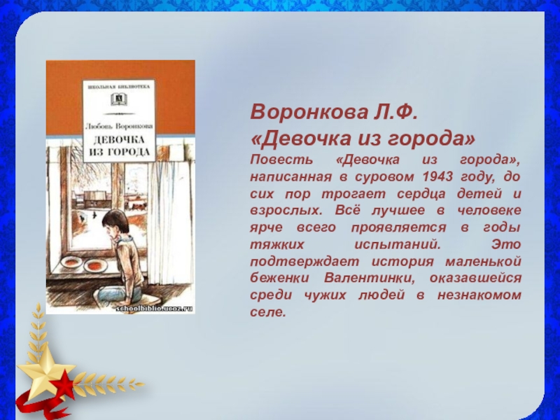1943 году, до сих пор трогает сердца детей и взрослых. Всё лучшее в человеке ярче всего проявляется в годы тяжких испытаний. Это подтверждает история маленькой беженки Валентинки, оказавшейся среди чужих людей в незнакомом селе.