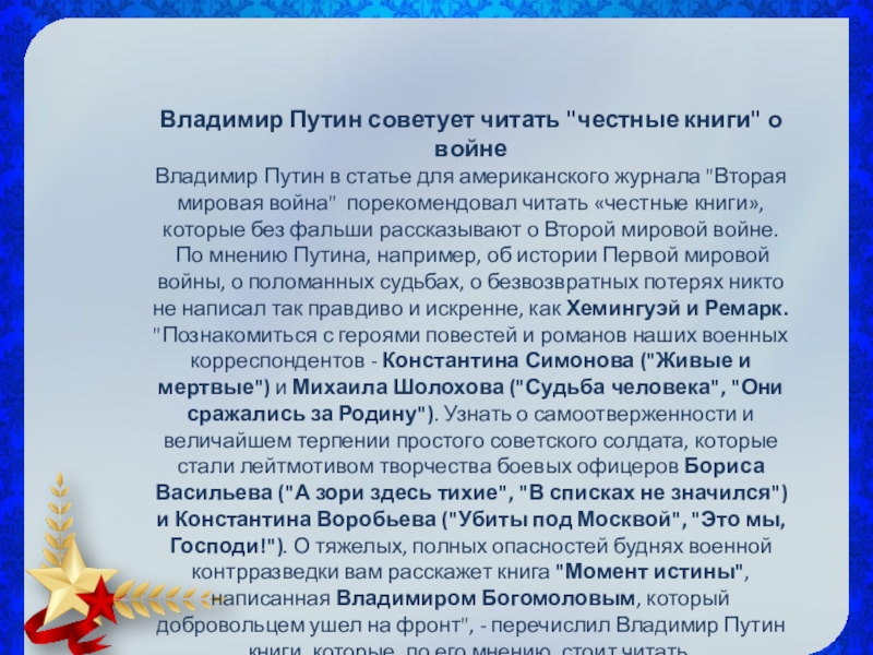 Слайд 19Владимир Путин советует читать "честные книги" о войне