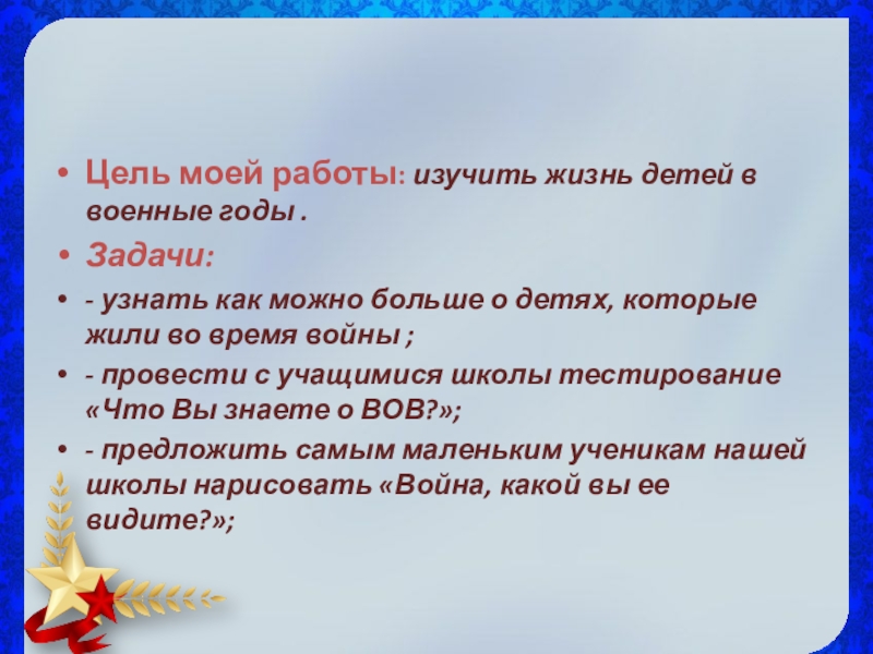 Слайд 4Цель моей работы: изучить жизнь детей в военные годы .