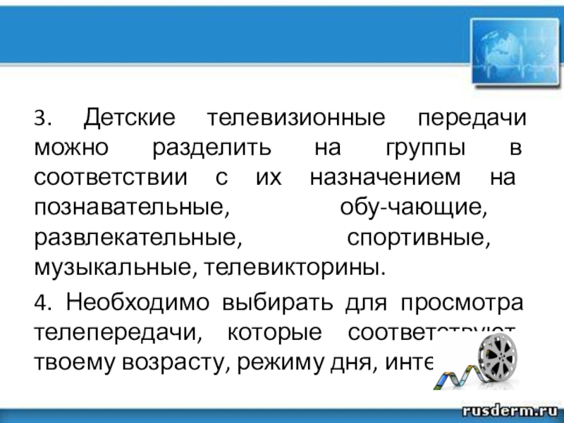 4. Необходимо выбирать для просмотра телепередачи, которые соответствуют твоему возрасту, режиму дня, интересам.