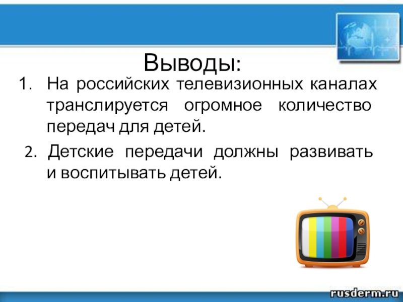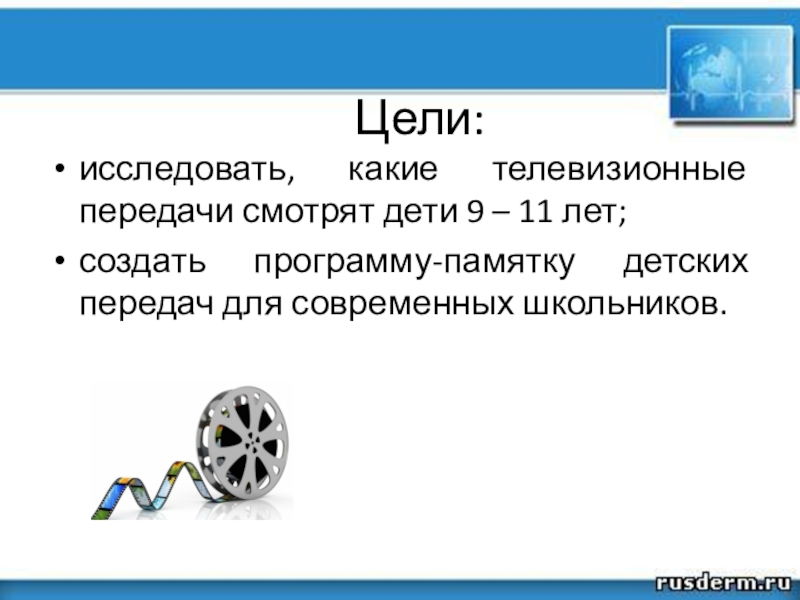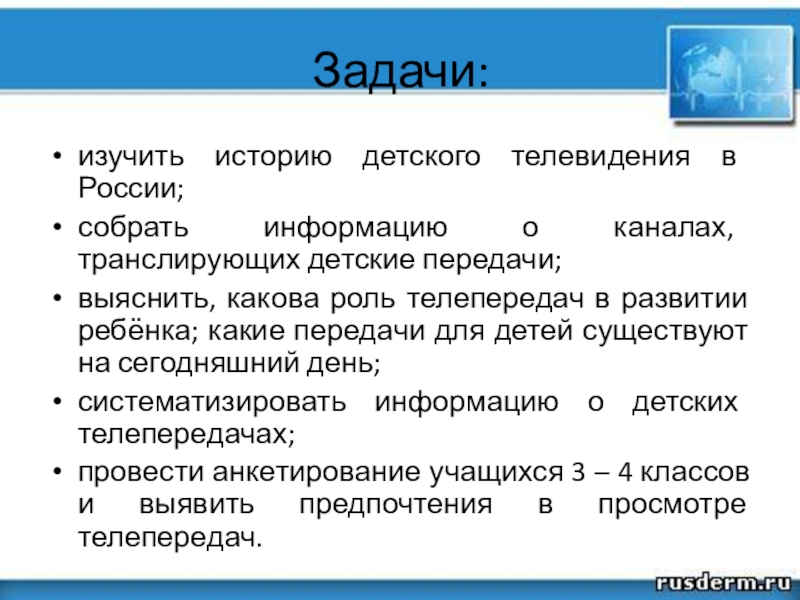 выяснить, какова роль телепередач в развитии ребёнка; какие передачи для детей существуют на сегодняшний день;