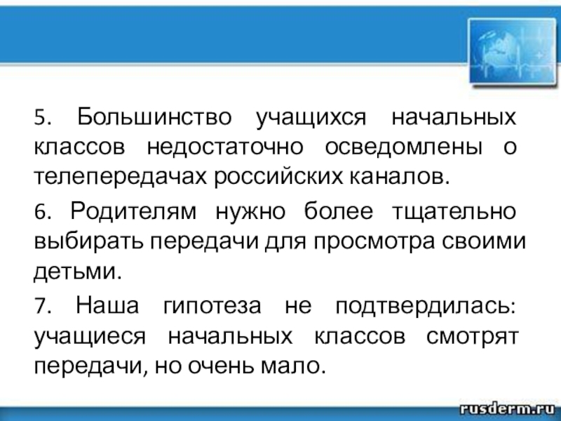 Слайд 275. Большинство учащихся начальных классов недостаточно осведомлены о телепередачах российских каналов.