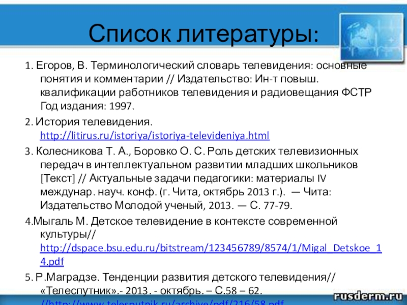 5. Р.Маградзе. Тенденции развития детского телевидения// «Телеспутник».- 2013. - октябрь. – С.58 – 62. //http://www.telesputnik.ru/archive/pdf/216/58.pdf