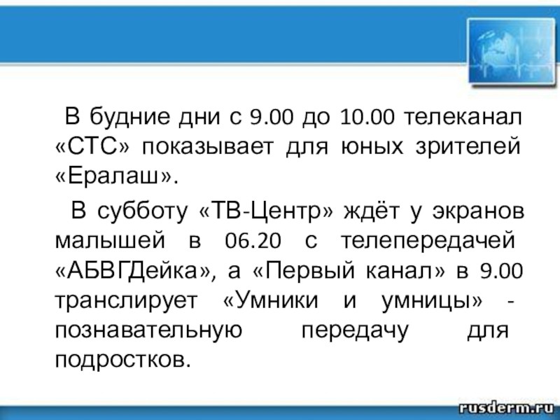 Слайд 15 В будние дни с 9.00 до 10.00 телеканал «СТС»