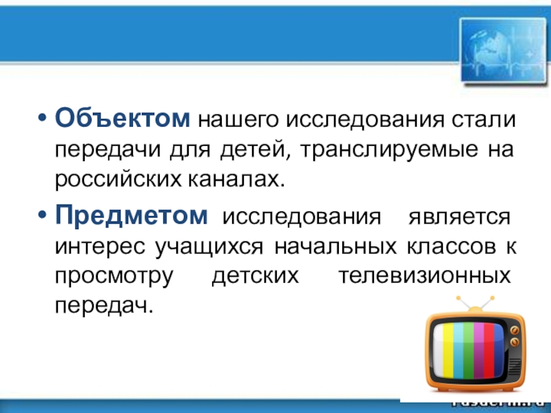 Слайд 3Объектом нашего исследования стали передачи для детей, транслируемые на российских каналах.