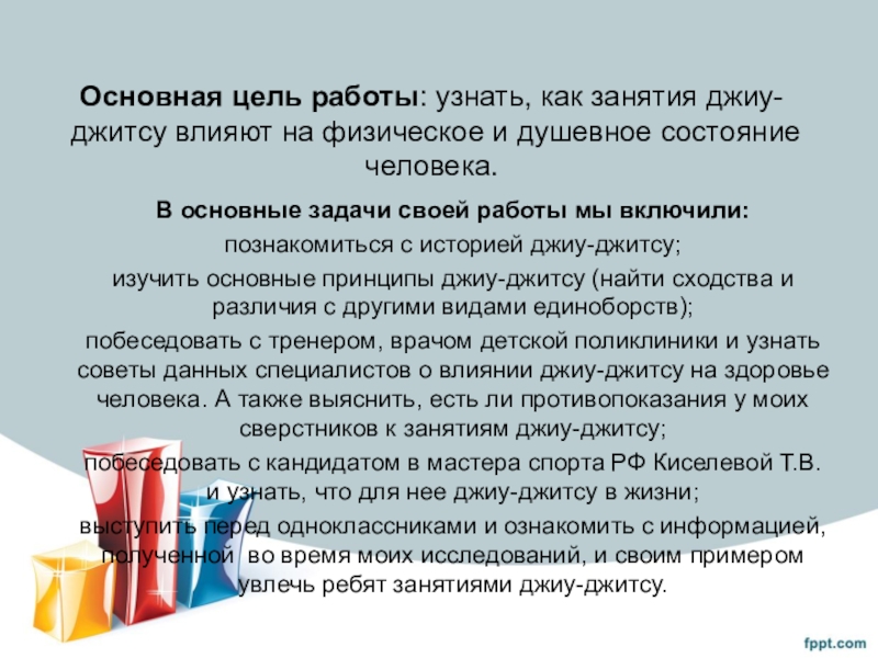 побеседовать с тренером, врачом детской поликлиники и узнать советы данных специалистов о влиянии джиу-джитсу на здоровье человека. А также выяснить, есть ли противопоказания у моих сверстников к занятиям джиу-джитсу;