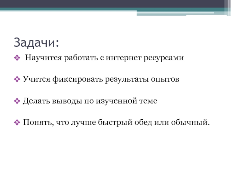 Задачи: Научится работать с интернет ресурсами  Учится фиксировать результаты опытовДелать выводы по изученной темеПонять, что лучше