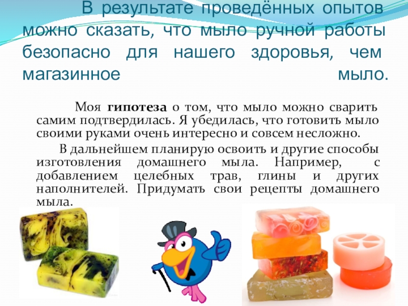 Моя гипотеза о том, что мыло можно сварить самим подтвердилась. Я убедилась, что готовить мыло своими руками очень интересно и совсем несложно.