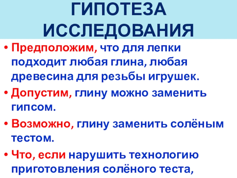 ГИПОТЕЗА ИССЛЕДОВАНИЯПредположим, что для лепки подходит любая глина, любая древесина для резьбы игрушек.Допустим, глину можно заменить гипсом.Возможно,