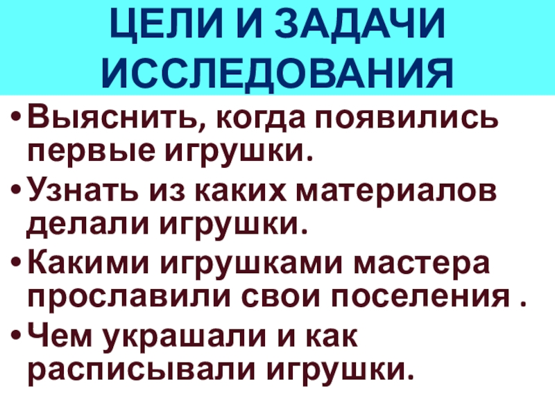 ЦЕЛИ И ЗАДАЧИ ИССЛЕДОВАНИЯВыяснить, когда появились первые игрушки.Узнать из каких материалов делали игрушки.Какими игрушками мастера прославили свои