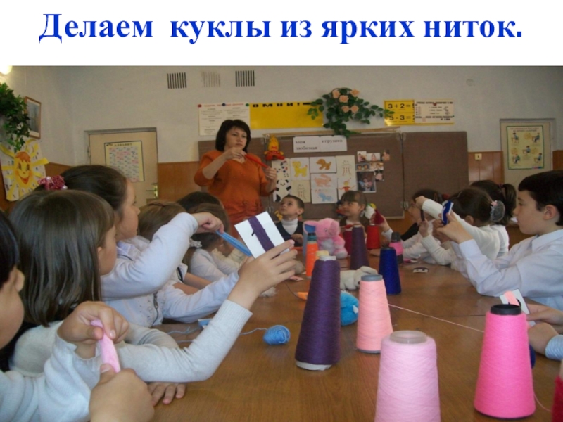 Слайд 32Делаем куклы из ярких ниток.