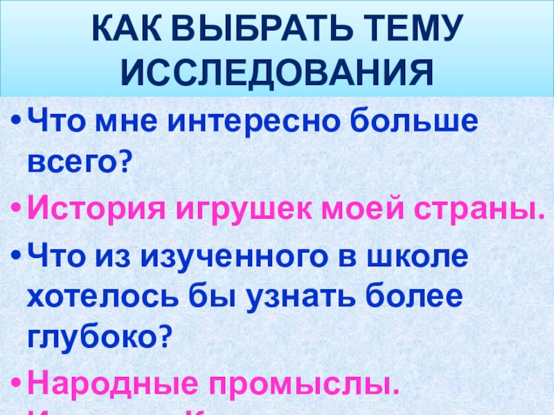 КАК ВЫБРАТЬ ТЕМУ ИССЛЕДОВАНИЯЧто мне интересно больше всего?История игрушек моей страны.Что из изученного в школе хотелось бы