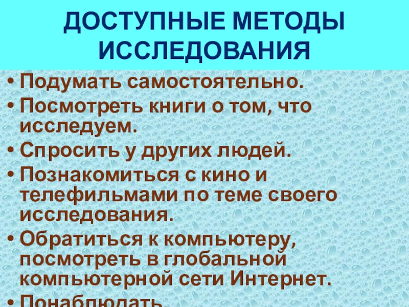 ДОСТУПНЫЕ МЕТОДЫ ИССЛЕДОВАНИЯПодумать самостоятельно.Посмотреть книги о том, что исследуем. Спросить у других людей.Познакомиться с кино и телефильмами