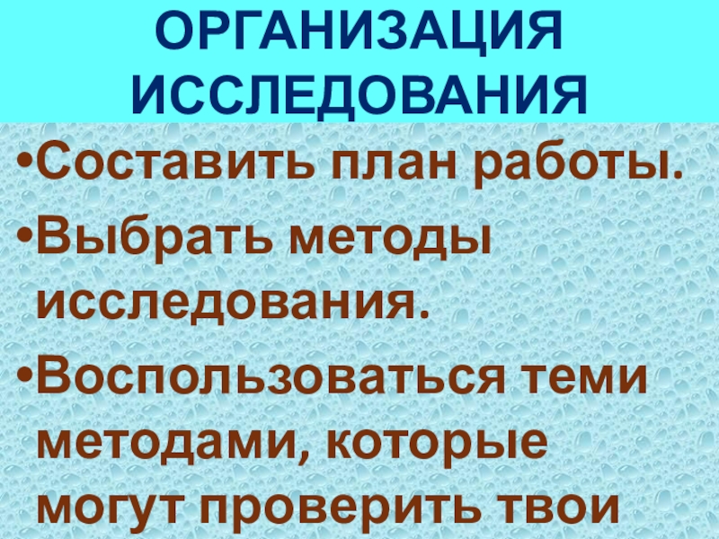 ОРГАНИЗАЦИЯ ИССЛЕДОВАНИЯСоставить план работы.Выбрать методы исследования.Воспользоваться теми методами, которые могут проверить твои гипотезы.