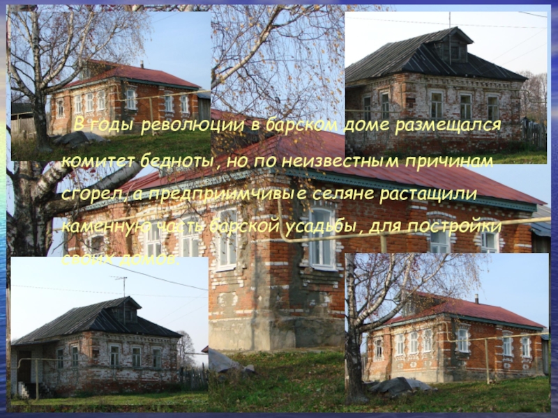 месте вырос 2-х этажный барский дом, окружённый хозяйственными постройками. Низ дома был из красного кирпича, верх деревянный, но, к большому сожалению, от усадьбы не осталось даже развалин, а в своё время в большом барском доме был свой театр, большой аквариум. Прислуга и дворня жили в другом месте, недалеко от барской усадьбы.