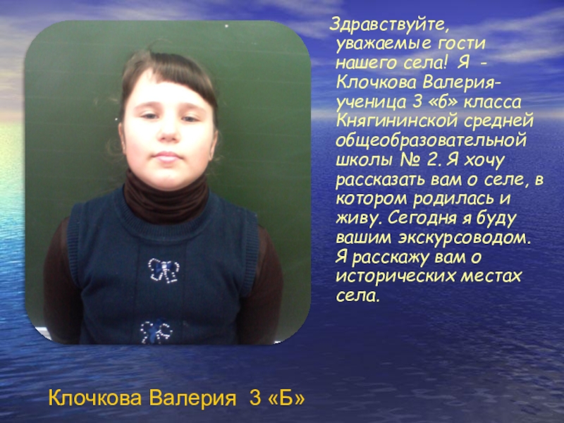 села! Я -Клочкова Валерия-ученица 3 «б» класса Княгининской средней общеобразовательной школы № 2. Я хочу рассказать вам о селе, в котором родилась и живу. Сегодня я буду вашим экскурсоводом. Я расскажу вам о исторических местах села.