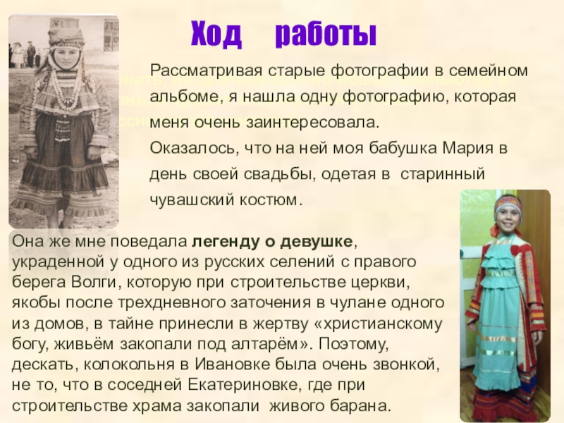 Рассматривая старые фотографии в семейном альбоме, я нашла одну фотографию, которая меня очень заинтересовала. Оказалось, что на ней моя бабушка Мария в день своей свадьбы, одетая в старинный чувашский костюм.