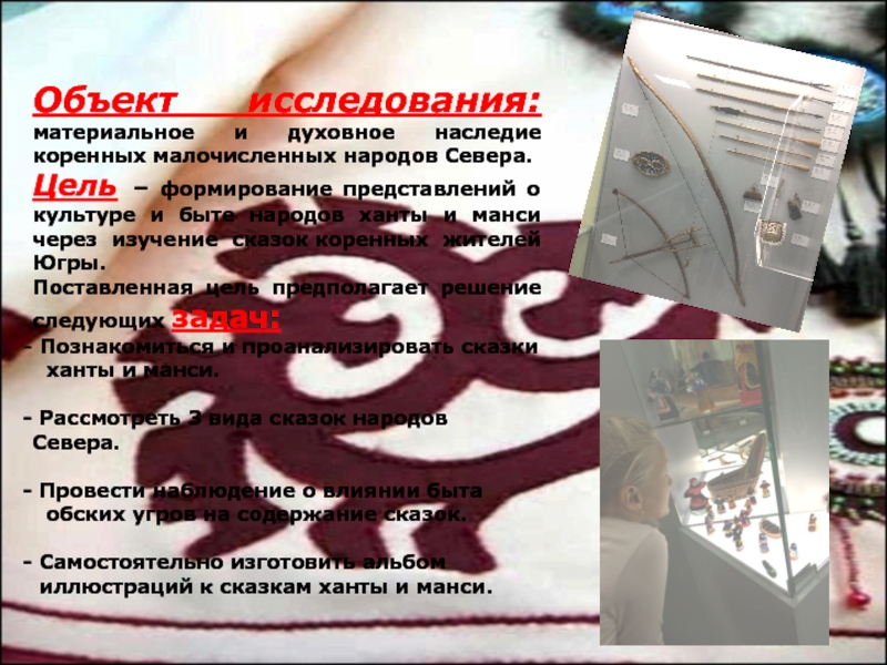 Слайд 2Объект исследования: материальное и духовное наследие коренных малочисленных народов Севера.