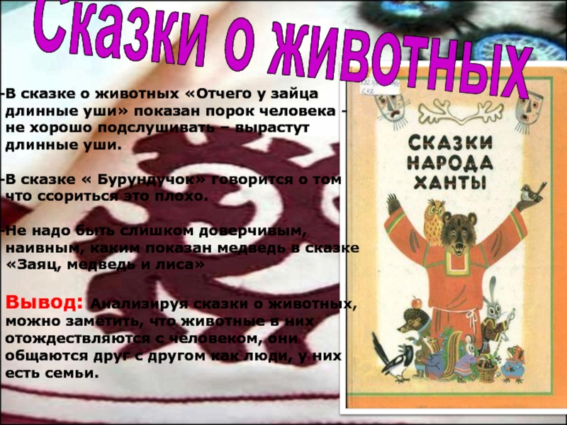 Вывод: Анализируя сказки о животных, можно заметить, что животные в них отождествляются с человеком, они общаются друг с другом как люди, у них есть семьи.