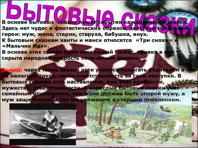 Вывод: через такие сказки дети учились помогать родителям в их нелегком труде, нести ответственность за свои поступки. В бытовых сказках есть наставления, они учат храбрости, мужеству, ответственности. А взрослые бытовые сказки учат семейным отношениям, как жена должна быть опорой мужу, а муж защитником, а так же уважению к старшим поколениям.