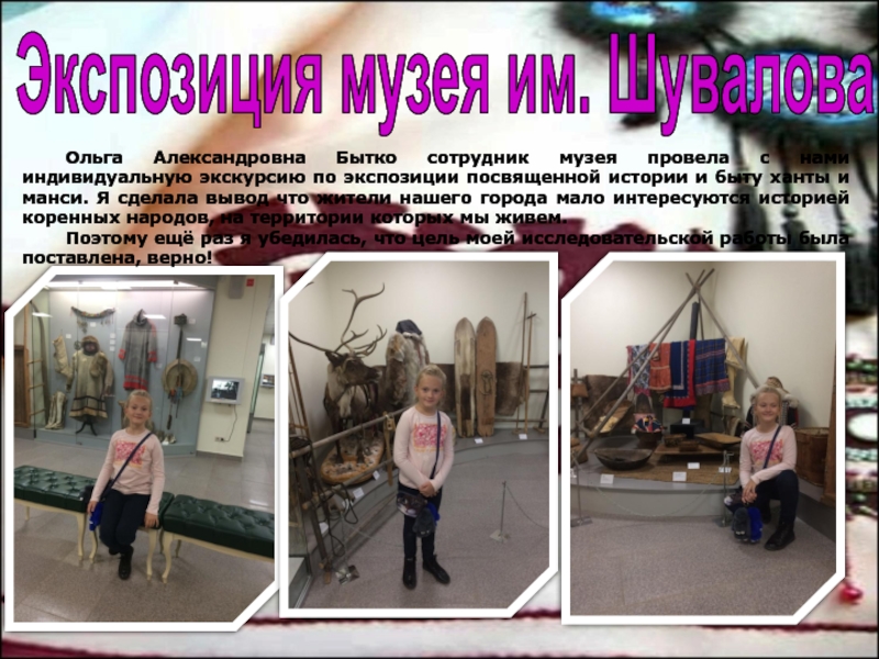 индивидуальную экскурсию по экспозиции посвященной истории и быту ханты и манси. Я сделала вывод что жители нашего города мало интересуются историей коренных народов, на территории которых мы живем.