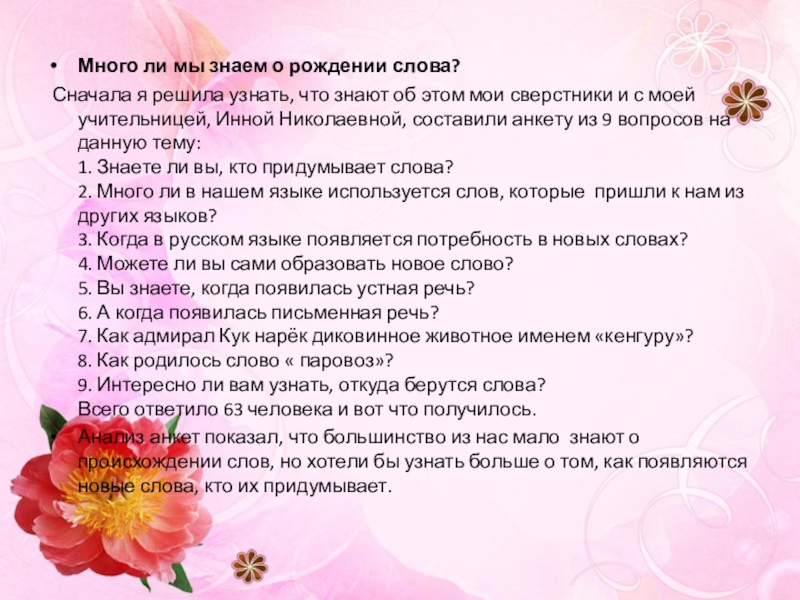 Анализ анкет показал, что большинство из нас мало знают о происхождении слов, но хотели бы узнать больше о том, как появляются новые слова, кто их придумывает.