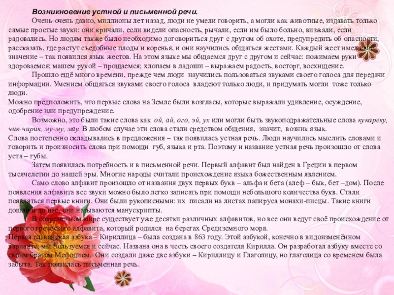 Слова постепенно складывались в предложения – так появилась устная речь. Люди научились мыслить словами и говорить и произносить слова при помощи губ, языка и рта. Поэтому и название устная речь произошло от слова уста – губы.