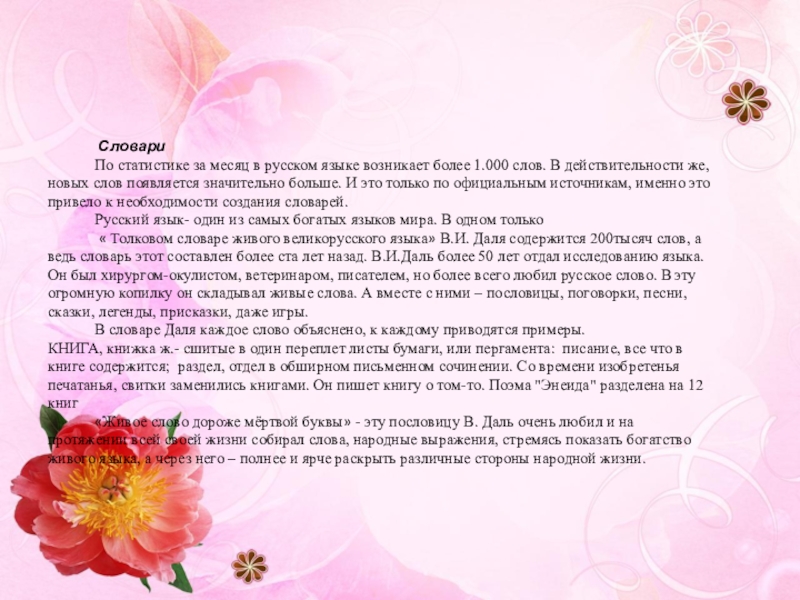 « Толковом словаре живого великорусского языка» В.И. Даля содержится 200тысяч слов, а ведь словарь этот составлен более ста лет назад. В.И.Даль более 50 лет отдал исследованию языка. Он был хирургом-окулистом, ветеринаром, писателем, но более всего любил русское слово. В эту огромную копилку он складывал живые слова. А вместе с ними – пословицы, поговорки, песни, сказки, легенды, присказки, даже игры.