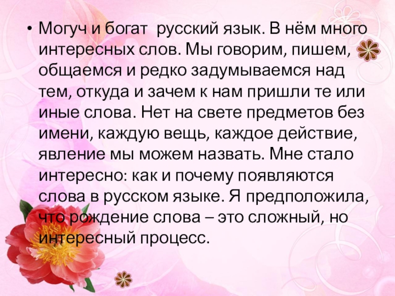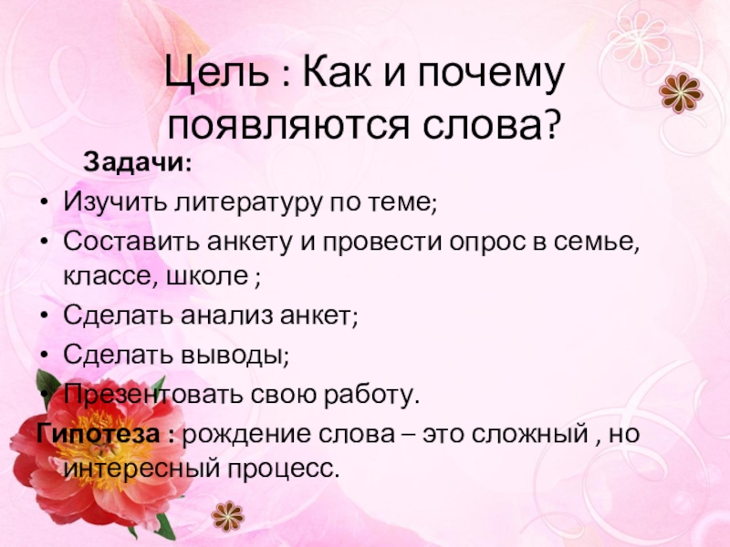 Гипотеза : рождение слова – это сложный , но интересный процесс.