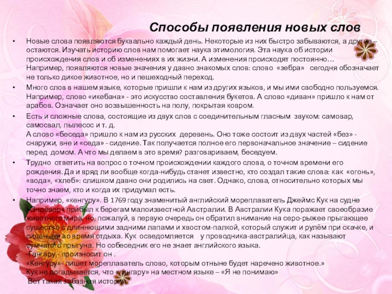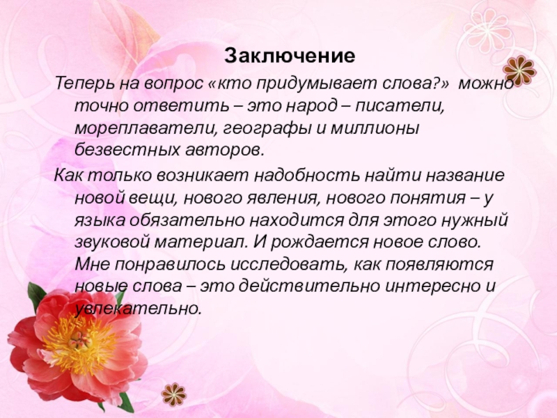 Как только возникает надобность найти название новой вещи, нового явления, нового понятия – у языка обязательно находится для этого нужный звуковой материал. И рождается новое слово. Мне понравилось исследовать, как появляются новые слова – это действительно интересно и увлекательно.