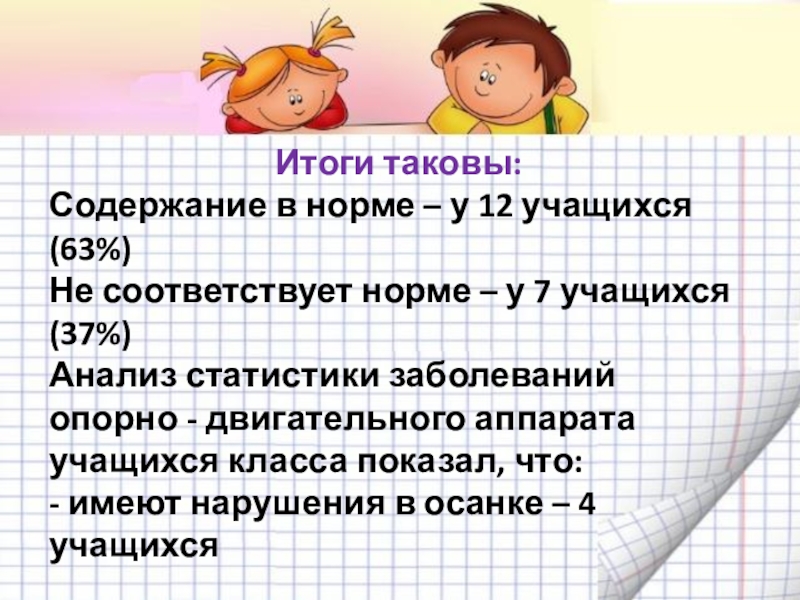 Итоги таковы:Содержание в норме – у 12 учащихся(63%)Не соответствует норме – у 7 учащихся (37%)Анализ статистики заболеваний