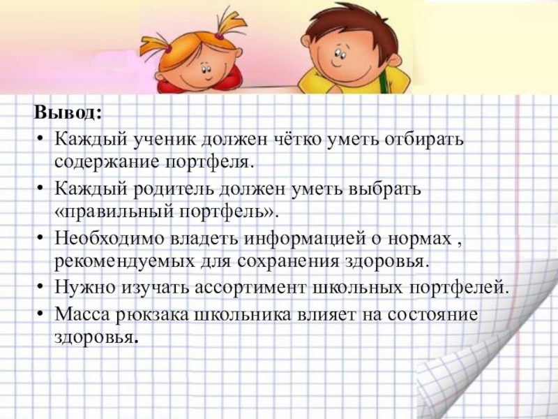 Вывод:Каждый ученик должен чётко уметь отбирать содержание портфеля.Каждый родитель должен уметь выбрать «правильный портфель».Необходимо владеть информацией о