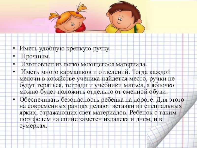 Иметь много кармашков и отделений. Тогда каждой мелочи в хозяйстве ученика найдется место, ручки не будут теряться, тетради и учебники мяться, а яблочко можно будет положить отдельно от сменной обуви.