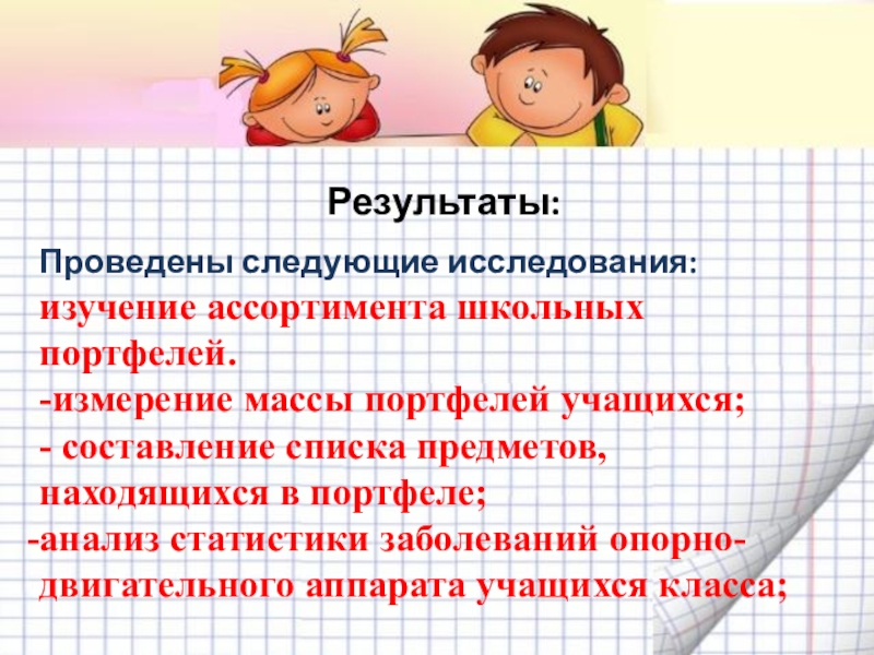 Результаты:Проведены следующие исследования:изучение ассортимента школьных портфелей.-измерение массы портфелей учащихся;- составление списка предметов, находящихся в портфеле;анализ статистики заболеваний