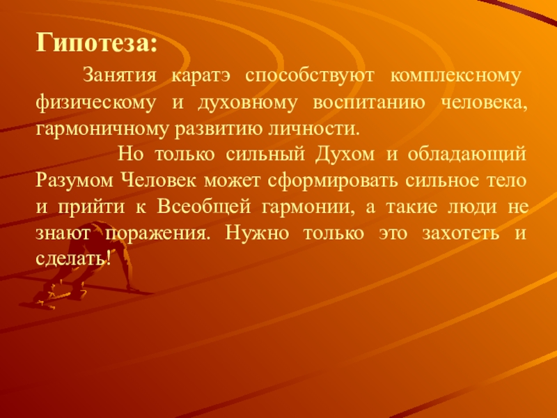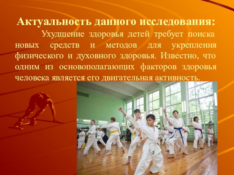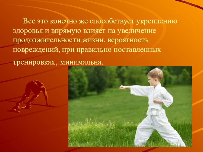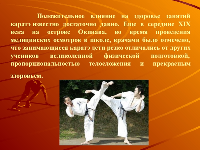 Слайд 13 Положительное влияние на здоровье занятий каратэ известно достаточно давно.
