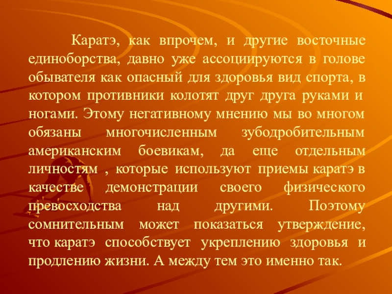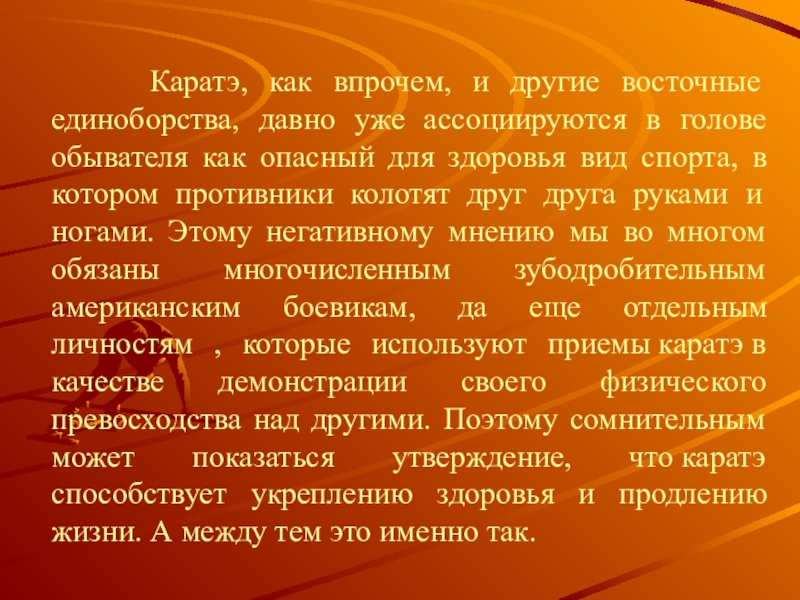 Слайд 8 Каратэ, как впрочем, и другие восточные единоборства, давно